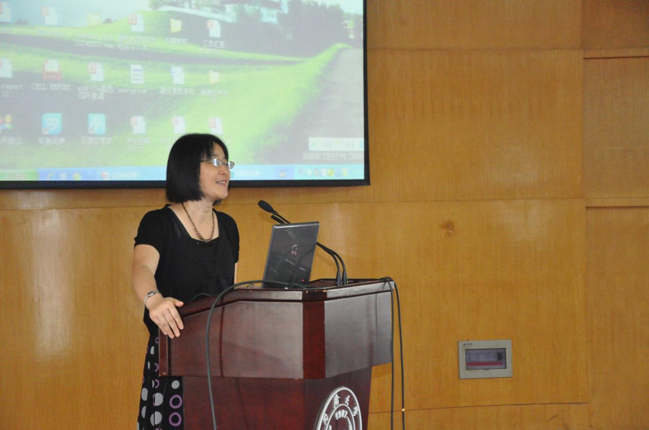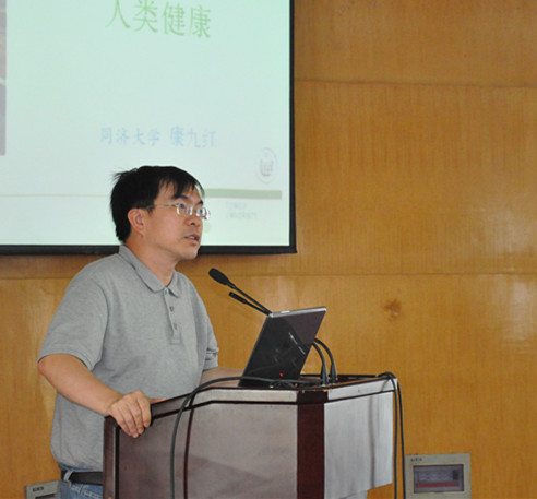 图为康九红书记以“21世纪的生命科学与人类健康”为题介绍生命学科发展发展前景