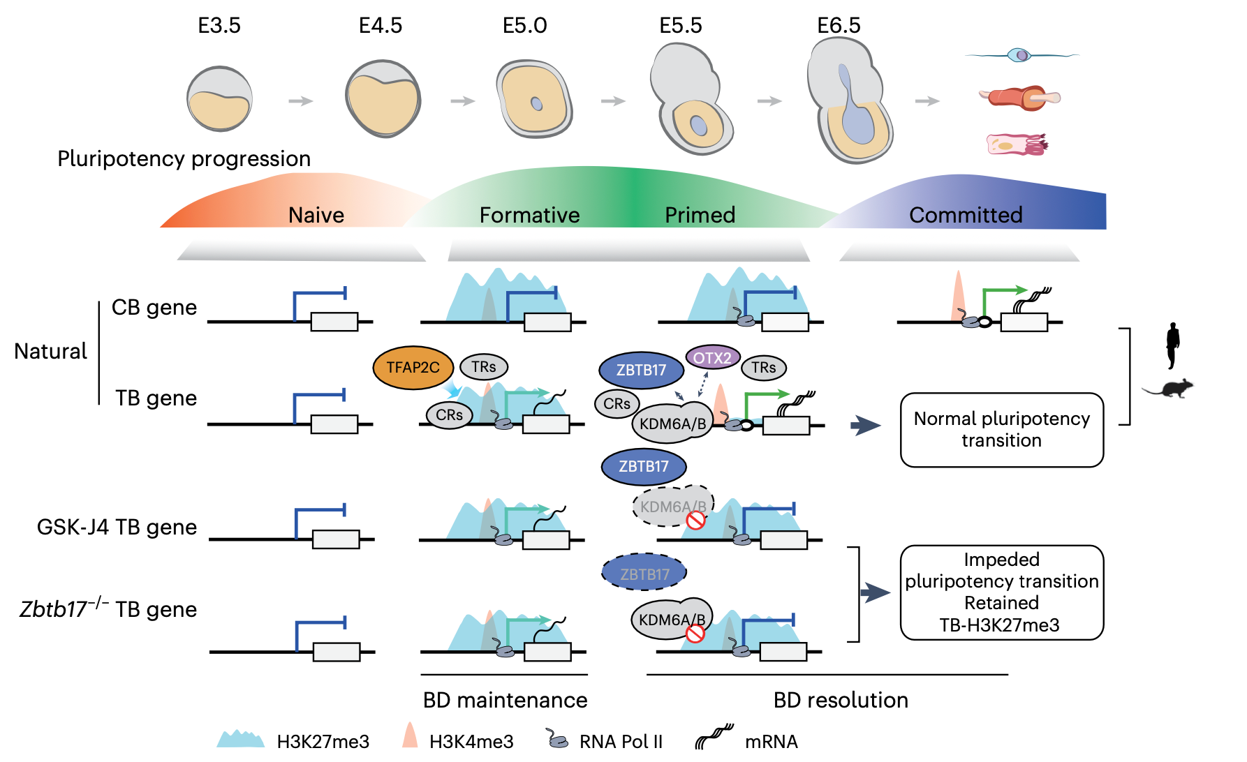 综上,本研究首次揭示了瞬时二价状态在小鼠围着床期胚胎发育中的关键作用,并发现ZBTB17与去甲基化酶 KDM6A/B 驱动TB 状态上的H3K27me3动态去除,确保多能性退出和谱系特化的时序进行。该发现不仅深化了对早期发育中表观遗传动态调控与细胞命运耦合机制的理解,也为研究多能性调控与发育障碍提供了新的理论框架。