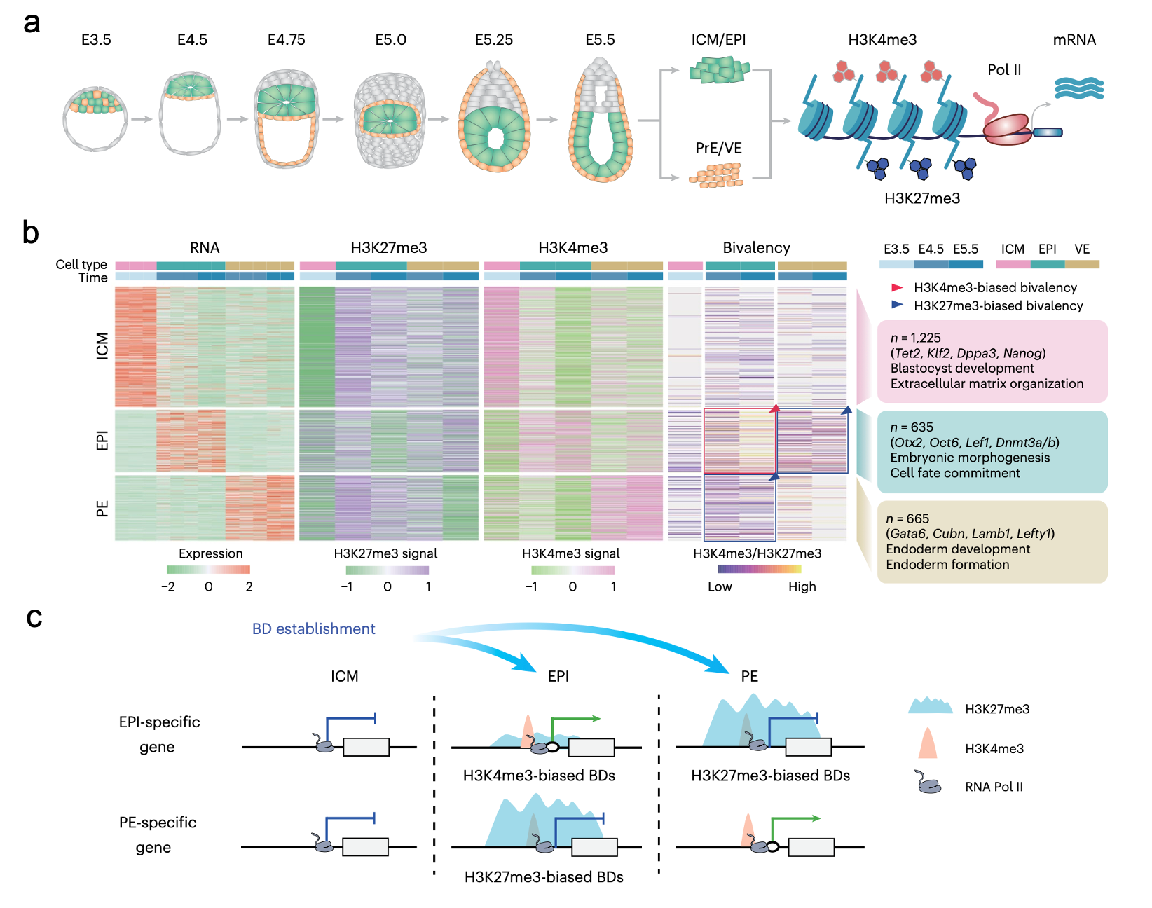在哺乳动物胚胎发育过程中,围着床期是决定胚胎谱系命运和妊娠建立的关键阶段,也是人类胚胎发生停育或流产的高发期。此时,胚胎通过高度协调的细胞增殖、迁移和谱系特化,从多能性逐步转向谱系特异性状态。在这一过程中,表观遗传调控,尤其是二价组蛋白修饰(bivalent histone modification),发挥了核心作用。