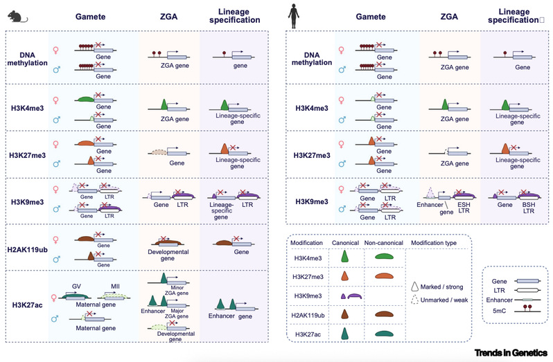 在哺乳动物的早期胚胎发育过程中,核心组蛋白修饰经历了广泛的重编程。在配子和受精卵中,多种组蛋白修饰,例如H3K4me3、H3K27ac等,都会呈现一种非经典的分布模式,从而在全能性建立中发挥独特的调控功能。而H3K27me3、H3K9me3等抑制性的组蛋白修饰也在胚胎基因激活及转座子表达中起到关键的调控作用。