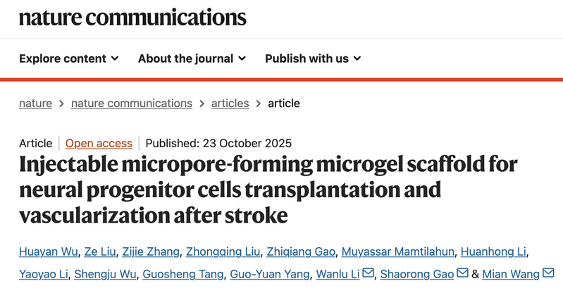 近日,天游线路检测中心高绍荣院士团队王冕研究员与上海交通大学李婉露教授团队在Nature Communications期刊上合作发表题为“Injectable Micropore-forming Microgel Scaffold for Neural Progenitor Cells Transplantation and Vascularization after Stroke”的研究论文。该研究开发了一种相分离微孔微凝胶(PSMM)-基质复合支架,可用于高效递送神经祖细胞(NPCs),能够通过促进血管生成和细胞存活,显著改善卒中大鼠的神经功能恢复。