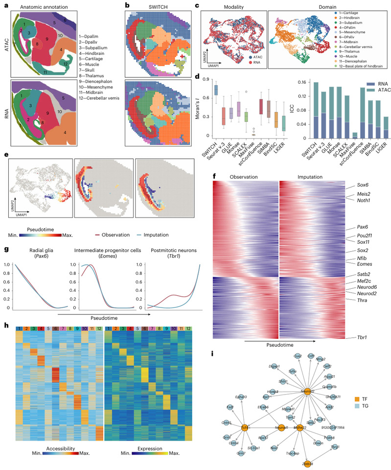 作者进一步将 SWITCH 应用于整合小鼠胚胎不同发育阶段的多组学数据,识别的空间域与形态学标注高度一致,能够保持清晰的空间域边界,并在 Moran’s I 与 ICC 等无监督指标上获得更优表现(图4)。基于 Monocle3 的皮层发育拟时序分析显示,从脑室带(VZ)到皮层板(CP)的时空梯度在两种模态中一致重现,表明整合的准确性。为了验证插补的准确性,作者使用RNA模态筛选出一系列随拟时序变化的基因,并发现其趋势在ATAC插补的表达中得到保留。此外,代表性的发育相关基因(如 Pax6、Eomes、Tbr1)呈现与既往认知一致的变化模式。进一步地,结合插补后的表达与可及性开展峰–基因关联分析,并与峰–motif 连接信息整合,SWITCH能够构建出具有空间域特异性的基因调控网络(GRN)。