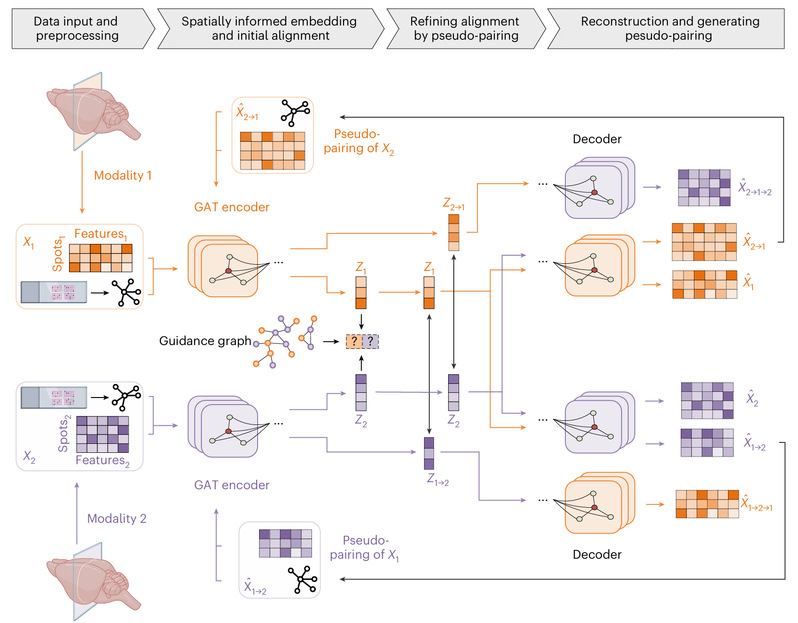 (1)空间感知表征。针对每一模态,基于空间坐标构建邻近图,引入 GAT 编码器学习空间感知的低维嵌入;再以模态特异的概率解码器回映至原特征空间。