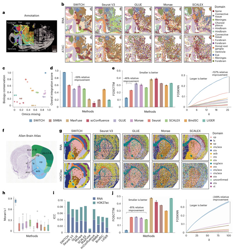 在具有真实标签的E13小鼠胚胎ATAC–RNA数据中,SWITCH 在组学混合(omics mixing)与生物变异保留(biological conservation)两类目标各 3 项指标的综合评分均优于对比方法,总体得分较次优方法提升 59%。同时在 Moran’s I 与 ICC 指标上取得最佳,显示更高的空间自相关与簇内同质性。基于 spot 层面的对齐评估相较第二名方法,FOSCTTM 降低 46%、FOSKNN 提升约 137%。