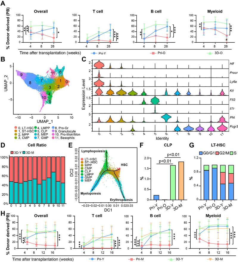 接下来,研究者通过对培养基成分和GelMA硬度的筛选优化,构建了BMSC与HSC体外3D共培养系统。他们发现与BMSC在柔软的5% GelMA中进行3D共培养能够促使HSC产生更多的造血干祖细胞。竞争性移植实验也证明柔软的5% GelMA比更硬的10% GelMA培养条件,以及相同数量未经培养的原代HSC具有更强的多谱系重建能力,尤其是淋系重建能力。由于衰老HSC的淋系分化能力明显减弱,因此研究者随即尝试利用该系统逆转HSC衰老。他们首先对原代年轻(2月龄)和中年(12月龄)HSC,以及3D共培养后的年轻和中年HSC进行了RNA-seq分析,发现淋系分化相关基因在3D共培养后(年轻和中年)的HSC中显著富集。与之相反,衰老相关基因则在3D共培养后的中年HSC中发生扭转。研究者通过对HSC线粒体膜电位和Cdc42/Tubulin极性分布分析发现,3D共培养可显著逆转HSC衰老标志物。此外,他们还通过竞争性移植实验证明3D共培养后的年轻和中年HSC的造血重建能力显著高于原代HSC,尤其是其淋系分化能力。更为重要的是,二次移植实验发现3D共培养后的年轻和中年HSC表现出与原代年轻HSC完全相同的多谱系长时程造血重建能力(图3)。研究者还分析了年老(24月龄)HSC的年轻化效果,并利用单细胞RNA测序(scRNA-seq)和移植实验对3D共培养后的淋系祖细胞(CLP)和HSC进行了深入分析,从而证明3D共培养可以促进CLP分化并有效逆转HSC衰老(图4)。