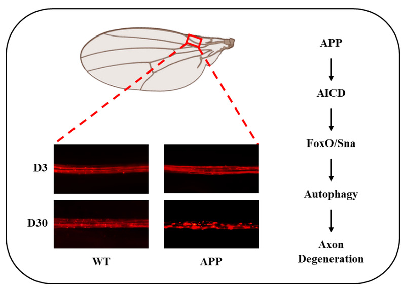 研究团队在果蝇翼神经元中特异性表达人源APP,成功构建了能够模拟AD相关轴突退变的新模型。发现APP的表达会引发年龄依赖性的轴突退化;这种退化不依赖于Aβ,而是依赖于AICD;AICD的单独过表达就足以诱导轴突退化;抑制细胞凋亡不能缓解APP/AICD引起的轴突破坏,但通过敲降自噬关键基因或使用自噬抑制剂氯喹,则能有效阻止轴突退化,表明该过程是自噬依赖性的。为进一步阐明机制,团队发现转录因子FoxO是APP/AICD诱导自噬和轴突退化所必需的。敲低FoxO或其互作蛋白Snail (Sna),均可抑制APP/AICD引发的自噬和轴突损伤。同时,AICD过表达会上调FoxO及其下游自噬起始基因Atg1的表达。功能实验证实,敲低Atg1能减轻APP/AICD诱导的轴突退化,而过表达Atg1即可引发轴突退化。这些结果共同揭示了 APP/AICD → FoxO/Sna → Atg1 → 自噬 → 轴突退化 这一完整的信号通路。