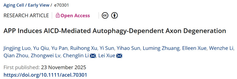 2025年11月23日,天游线路检测中心薛雷教授团队在国际知名期刊《Aging Cell》上发表了题为“APP Induces AICD-Mediated Autophagy-Dependent Axon Degeneration”的研究论文。该研究首次揭示了阿尔茨海默病关键蛋白APP通过其胞内结构域AICD,而非传统认为的Aβ,诱发年龄依赖性神经轴突退变的分子机制,并明确了自噬通路及下游dFoxO/Snail-Atg1轴在其中扮演的关键角色。这一发现为深入理解阿尔茨海默病的发病机制及开发新的治疗策略提供了重要理论依据和潜在靶点。