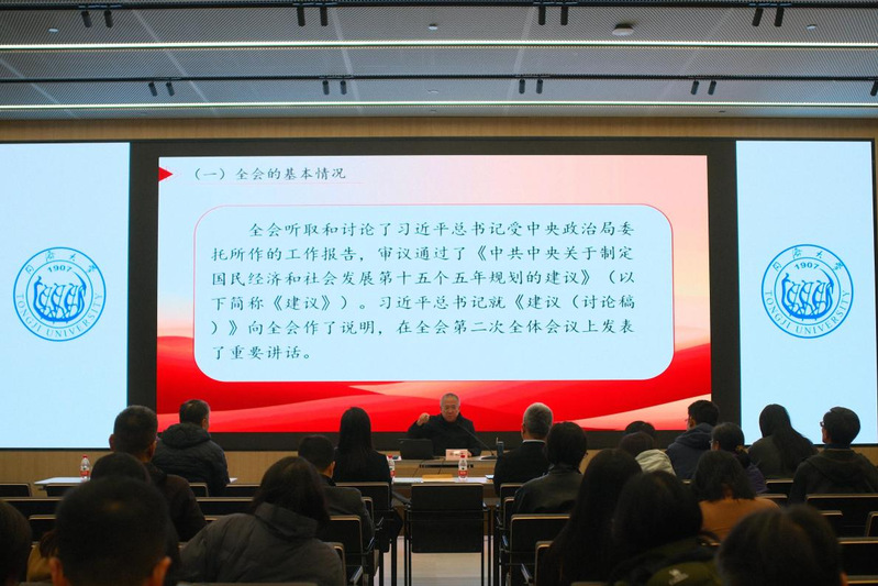 上海市学习贯彻党的二十届四中全会精神宣讲团成员、复旦大学政党建设与国家发展研究中心主任郑长忠教授作专题辅导报告。郑长忠系统解读了全会召开的时代背景、重大意义及《中共中央关于制定国民经济和社会发展第十五个五年规划的建议》的起草过程和核心内容。他重点阐述了“十四五”时期取得的重大成就、“十五五”时期在社会主义现代化进程中的重要地位、国内外形势的基本判断以及“十五五”时期经济社会发展的指导思想、重大原则、主要目标和战略任务,并围绕建设现代化产业体系、加快高水平科技自立自强、推动文化繁荣、保障改善民生等方面进行了深入阐释。报告逻辑清晰、内容丰富、论述精辟,既有理论高度、又有实践深度,对与会教师深刻理解、准确把握全会的精神实质和丰富内涵具有重要的指导意义。