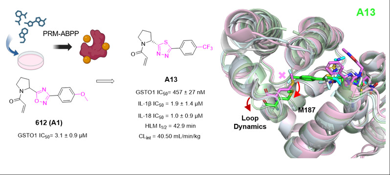 研究团队利用自建的共价片段化学蛋白质组学平台,从内部电亲性片段库中筛选出丙烯酰胺类化合物A1,发现其可共价结合GSTO1蛋白的Cys32残基。与通常稳定蛋白的DSF结果相反,A1显著降低GSTO1热稳定性,提示其可能通过变构机制诱导构象变化。经构效关系优化,获得衍生物A13,其共价结合效率优异(kinact/KI = 226 M⁻¹·s⁻¹),且在人肝微粒体中代谢稳定。高分辨率晶体结构(PDB:9LHF)显示,A13结合于一个由Trp222、Arg183和Met187构成的新型疏水变构口袋,其4-三氟甲基苯环引起Met187位移,驱动蛋白构象重塑,为后续抑制剂设计提供了结构基础。