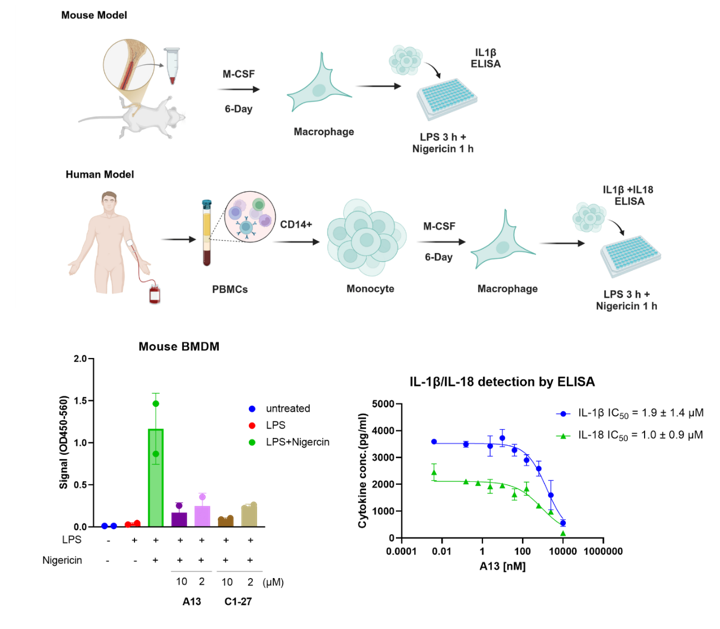 研究团队进一步通过细胞水平验证与机制探究,证实了A13的作用靶点及功能特征。在HEK293T细胞中,CETSA热稳定性实验与CMFDA荧光探针标记实验均表明,A13能够在细胞内稳定结合并占据GSTO1的活性位点。与此同时,团队合成了A13衍生物的炔基探针,通过Click–Pulldown结合质谱鉴定手段,验证了A13在全蛋白质组水平上的共价结合选择性,为其分子靶点确认提供了有力证据。在功能层面,A13对炎症信号通路展现出显著调控作用:在巨噬细胞模型中,A13处理可明显抑制LPS/Nigericin诱导的IL-1β和IL-18分泌,半抑制浓度(IC₅₀)分别为1.9 μM和1.0 μM,显示出优异的抗炎活性本研究整合PRM质谱筛选、结构解析与化学优化,形成了从苗头化合物发现到机制阐明的完整研究体系。A13可作为探究GSTO1功能的化学探针,也为针对GSTO1的共价药物开发提供了新方向。