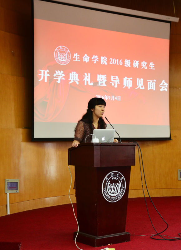 典礼上,生科院党委书记康九红教授在致辞中向新同学的到来表示了热烈的欢迎。康书记在讲话中对2016级新生提出了三点建议和希望:第一,身为同济的一员,要始终坚持严谨求实的学风。无论科研成果如何,我们都要做真实的科研。认真记录原始数据,保护好自己,科研允许犯错但决不让容忍造假。第二,名师出高徒,高徒助名师。作为生科院的一员,要有责任感和使命感,希望广大新生树立远大、正确的理想,教学相长,生科院的振兴需要每一位生科人的努力。第三,做科研要兴趣导向,平时多看文献、听报告,学习科研前沿,掌握最新资料。同学之间在学术和生活方面要互帮互助,融为一个积极向上的大家庭。