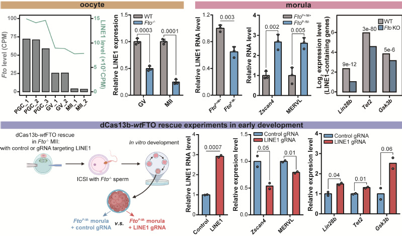 图2. FTO参与卵发育与早期胚胎中LINE1 RNA及下游基因的调控