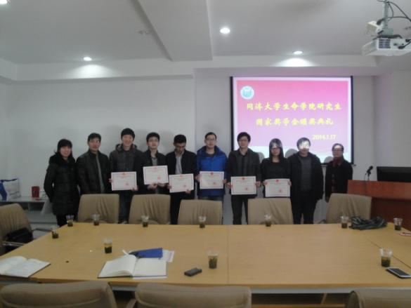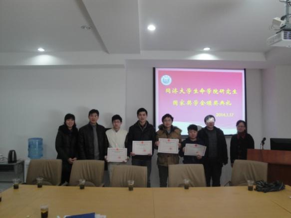 2014年1月17日上午,生命学院2013年研究生国家奖学金颁奖仪式于医学楼1101室举行。学院党总支书记康九红教授、评审专家代表高绍荣教授和副书记陈一希老师以及获奖学生出席。